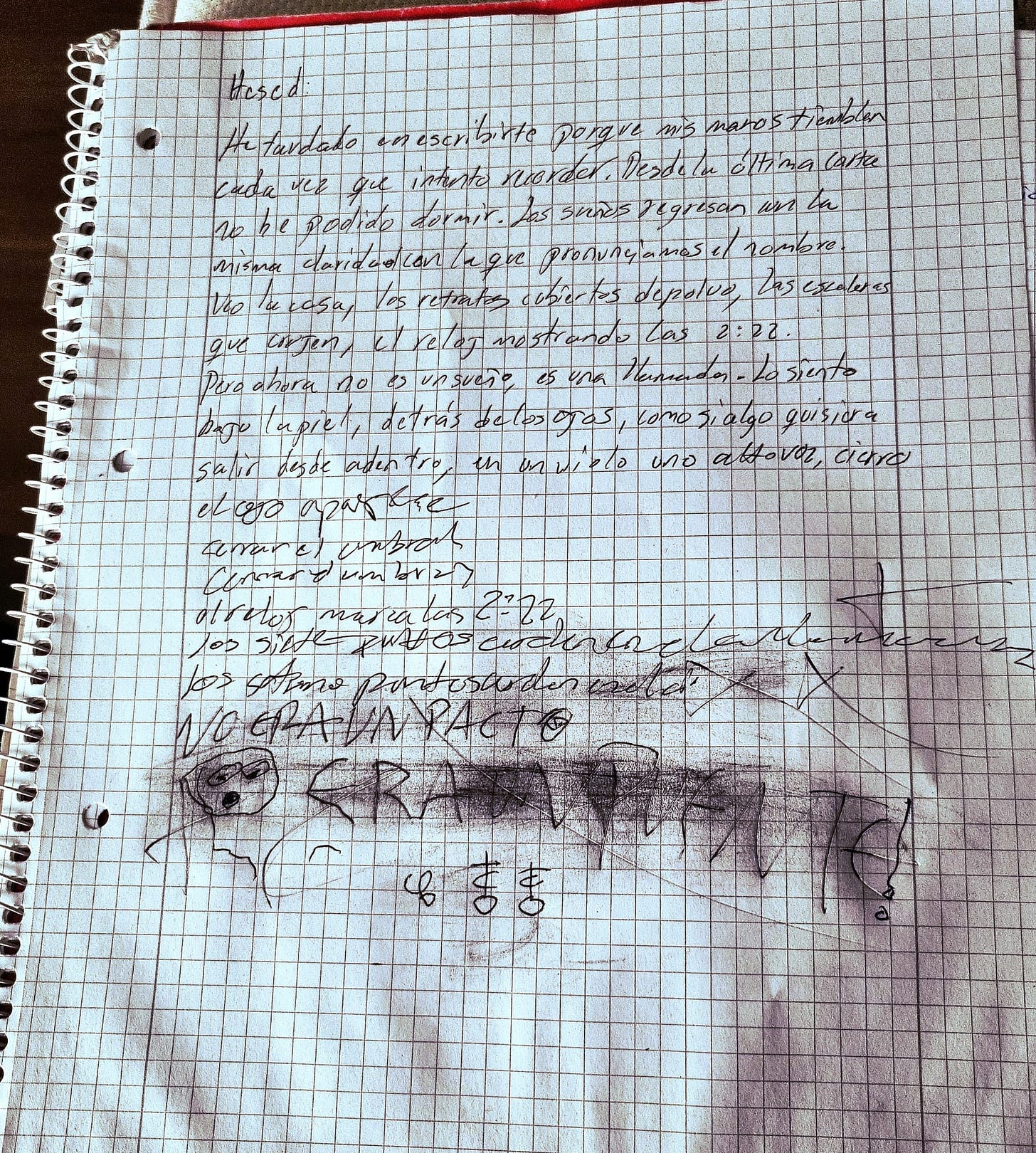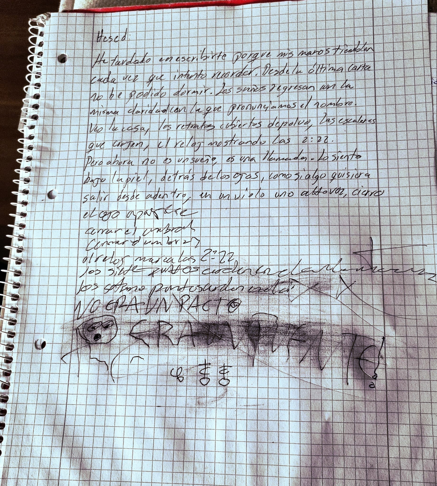En tu mensaje anterior me preguntabas si Nina acaso había dibujado un símbolo detrás de su carta. La respuesta es sí, un símbolo de espirales: “Lugar infringido” dice en latín, es el mismo aviso que recibo en mis sueños, además de las advertencias. Algo hicimos mal aquella vez.